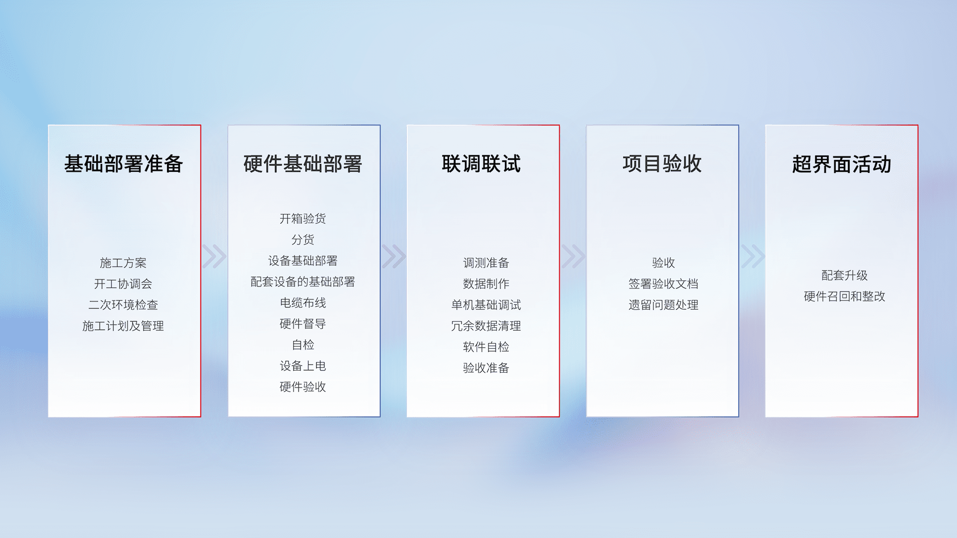 从基础部署准备、、硬件基础部署、、、、联调联试、、、项目验收、、、、越界面活动的全过程可追溯,,,,保证施工质量和进度。。。。